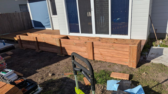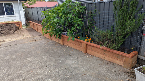 A family in Corrimal initially required two 3m beds to look like a single 6m bed in front of their granny flat. They like them so much they ordered another 2 wicking beds and a standard raised bed. We also encased their existing border bed with our timber style to match.